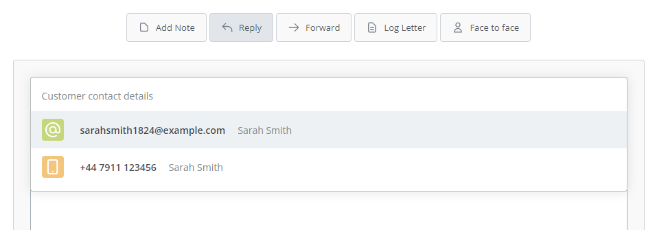 “Send E-Mail” and “Send SMS” have now been merged into one “Reply” panel, and there is a new menu to select which of the customer’s contact details you want to send the reply to. You’ll see all of the customer’s email addresses or cell phone numbers here, but you’ll only be able to select cell phone numbers if you have SMS replies enabled for your organization.