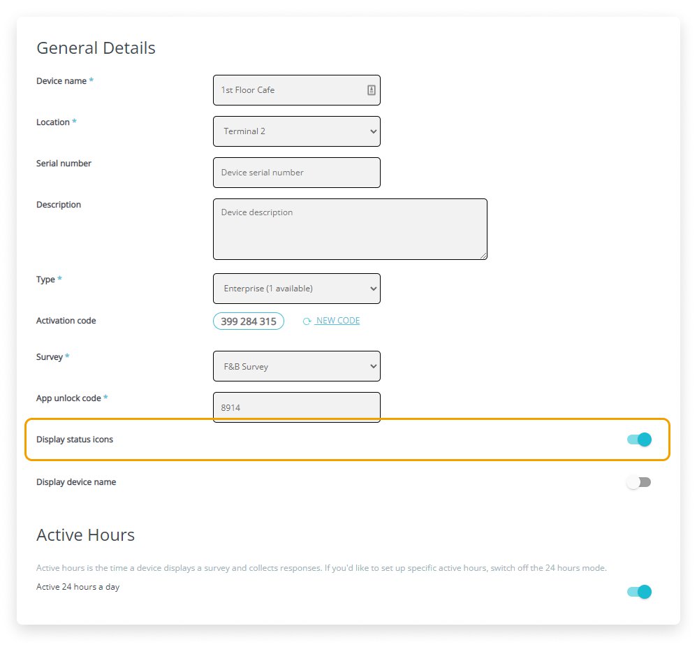 1. You can choose to show it permanently at all times at the top of the screen. This can be enabled in each device’s settings from the Devices page of the Avius system. If you don’t already have access to the system, please contact Avius Support. You can also choose to display the device name here, which then appears on the left side of the status bar. This can be useful when you have multiple ‘roaming’ devices, or during installation of devices, for example.