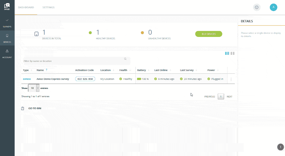 Loginto Avius Surveys and click on Devices in the left-hand menu to see your list of devices.